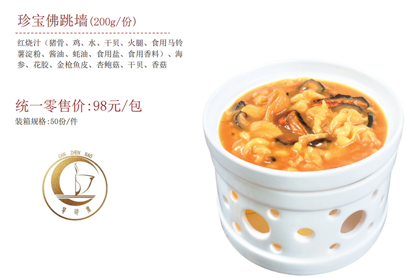 珍寶佛跳墻(200g/份) 紅燒汁(豬骨、雞、水、干貝、火腿、食用馬鈴 薯淀粉、醬油、蠔油、食用鹽、食用香料)、海 參、花膠、金槍魚皮、杏鮑菇、干貝、香菇 統(tǒng)一零售價:98元/包 裝箱規(guī)格:50份/件 共0條 相關評論 |