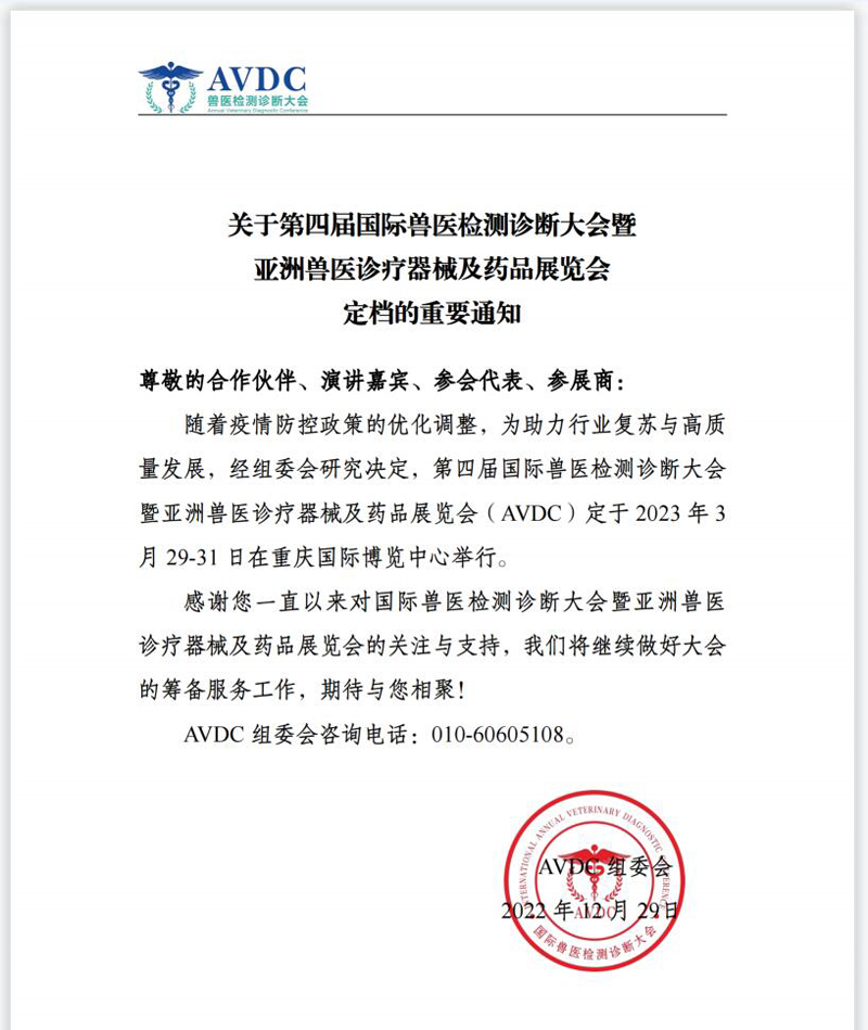隨著疫情防控政策的優(yōu)化調(diào)整,為助力行業(yè)復(fù)蘇與高質(zhì)量發(fā)展,經(jīng)組委會研究決定,第四屆國際獸醫(yī)檢測診斷大會暨亞洲獸醫(yī)診療器械及藥品展覽會(AVDC)定于2023年3月29-31日在重慶國際博覽中心舉行。
