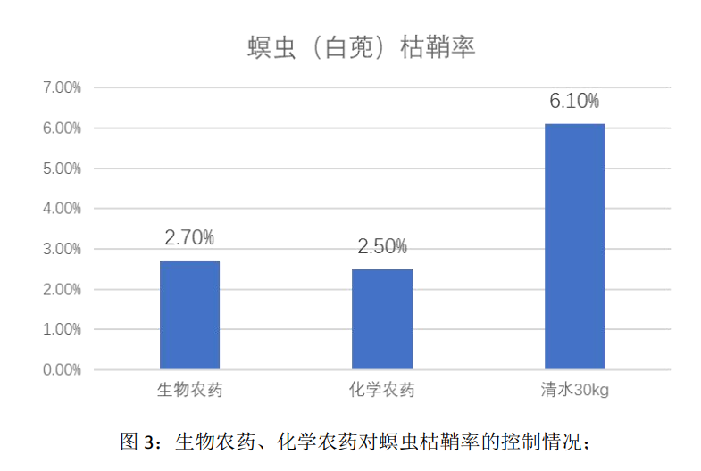 經(jīng)田間蟲情調(diào)查統(tǒng)計(jì), 無論是每次防治產(chǎn)品施入后調(diào)查還是成熟期調(diào)查結(jié)果分析: 處理 A 畝用生物農(nóng)藥制劑 123*100ml 兌水 30kg 均勻噴霧病蟲防治效果