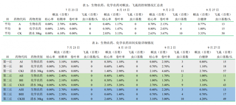 2022 7 18 日、2022 8 10 日、2022 8 28 日嚴(yán)格按試驗(yàn)方案進(jìn)行對(duì)比試驗(yàn)相關(guān)處理實(shí)施, 每次噴施后第 5天組織技術(shù)人員對(duì)蟲害發(fā)生情況進(jìn)行大田調(diào)查、 并于 9 27 日成熟期對(duì)蟲害發(fā)情況進(jìn)行大田調(diào)查統(tǒng)計(jì)。