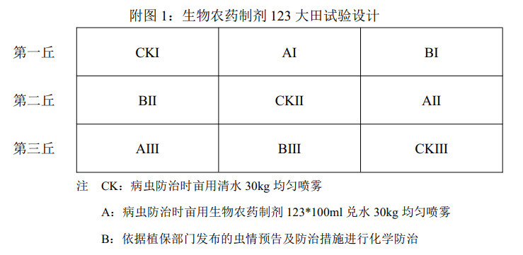 3 畝左右肥力均勻且鄰近的水田 3 丘, 并將丘田均分為三份, 共設(shè)計(jì)生物農(nóng)藥制劑 123、 化學(xué)農(nóng)藥、 空白三個(gè)處理三次重復(fù)對(duì)比試驗(yàn)。 (詳見附圖