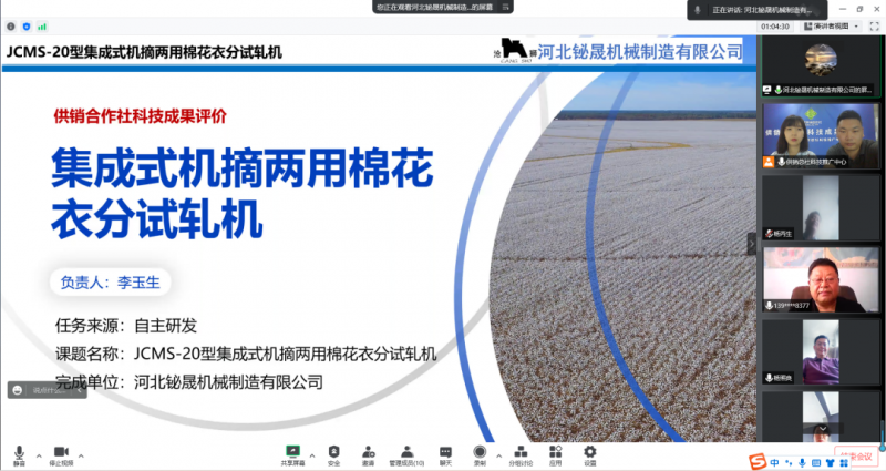 2022年9月,受河北鉍晟機(jī)械制造有限公司委托,中華全國供銷合作總社科技推廣中心作為供銷合作系統(tǒng)內(nèi)唯一受總社委托開展科技成果管理相關(guān)工作的機(jī)構(gòu),按照科技部《科技成果評價(jià)辦法》,本著“科學(xué)、獨(dú)立、客觀、公正”的原則,組織七位相關(guān)領(lǐng)域?qū)<覍?/span>“MJS20-280型集成式棉花衣分試軋機(jī)”成果進(jìn)行了科技評價(jià)。