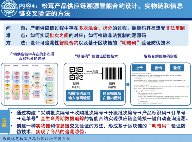 專家組經(jīng)評(píng)議認(rèn)為,成果針對(duì)松茸和靈芝等“名優(yōu)特”高附加值農(nóng)產(chǎn)品溯源難題,創(chuàng)建了我國(guó)第一個(gè)面向松茸和靈芝等“名優(yōu)特”高附加值農(nóng)產(chǎn)品的區(qū)塊鏈溯源系統(tǒng),基于區(qū)塊鏈技術(shù)設(shè)計(jì)了一種能夠?qū)崿F(xiàn)實(shí)物鏈和信息鏈交叉驗(yàn)證的“明暗碼”驗(yàn)證防偽技術(shù),建立基于區(qū)塊鏈架構(gòu)的鏈上鏈下數(shù)據(jù)融合機(jī)制,解決了農(nóng)產(chǎn)品區(qū)塊鏈溯源系統(tǒng)“如何建”的難題,具有重要的理論價(jià)值和實(shí)際應(yīng)用價(jià)值。成果研發(fā)的“松茸產(chǎn)品區(qū)塊鏈溯源系統(tǒng)”在西藏達(dá)娃曲珍實(shí)業(yè)有限公司及林芝市巴河鎮(zhèn)朱拉松茸合作社開(kāi)展了實(shí)際應(yīng)用和示范工程建設(shè),解決了松茸和靈芝等“名優(yōu)特”高附加值農(nóng)產(chǎn)品的溯源難題,已取得明顯的經(jīng)濟(jì)和社會(huì)效益。成果面向我國(guó)松茸和靈芝等“名優(yōu)特”高附加值農(nóng)產(chǎn)品的溯源需求,為松茸等高附加值農(nóng)產(chǎn)品供應(yīng)鏈溯源提供新的解決方案,提升了農(nóng)產(chǎn)品供應(yīng)鏈信息的透明度并實(shí)現(xiàn)了溯源信息的不可篡改性,提高了消費(fèi)者對(duì)松茸等高附加值農(nóng)產(chǎn)品的信任程度,對(duì)于提升松茸產(chǎn)品供應(yīng)鏈數(shù)字化水平和降低農(nóng)產(chǎn)品企業(yè)經(jīng)營(yíng)成本具有重要意義,推廣應(yīng)用前景廣闊。成果總體達(dá)到國(guó)內(nèi)領(lǐng)先水平,其中“基于區(qū)塊鏈的‘明暗碼’驗(yàn)證防偽技術(shù)”及“‘雙軌’鏈上鏈下數(shù)據(jù)融合機(jī)制”達(dá)到國(guó)際先進(jìn)水平。