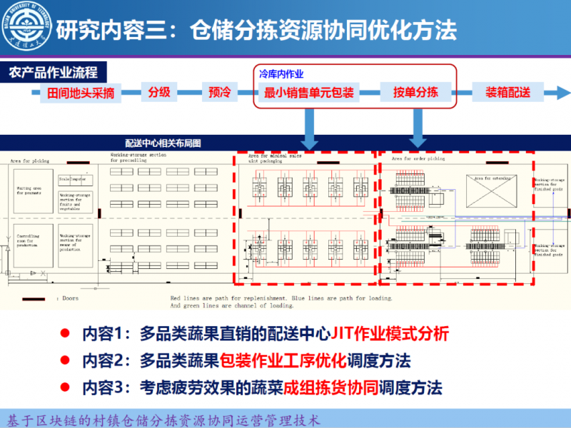 專家組經(jīng)評議認為,成果針對村鎮(zhèn)倉儲分揀資源協(xié)同運營管理難題,采用區(qū)塊鏈技術、優(yōu)化理論方法等,構建了基于區(qū)塊鏈技術的安全可信、高效匹配和可信交易的分散冷庫倉儲資源共享平臺系統(tǒng),提出了綜合考慮多目標、多類型服務資源、多環(huán)節(jié)協(xié)同銜接的冷鏈倉儲預處理設施協(xié)同運作優(yōu)化新方法,設計了考慮疲勞效果和工人效率變化的多品類蔬果標準銷售單元包裝作業(yè)和個性化訂單分揀作業(yè)的優(yōu)化新方法,富有創(chuàng)新性,具有重要的理論價值與應用價值。成果研發(fā)的“村鎮(zhèn)倉儲分揀資源協(xié)同運營管理技術”,在陜西洛川縣、西藏林芝等地的水蜜桃、蘋果、松茸等村鎮(zhèn)產(chǎn)業(yè)以及北京昊宇神鷹公司分揀中心作業(yè)中進行了應用與示范,驗證了方法與技術的可行性,取得了顯著的社會效益和經(jīng)濟效益。成果面向我國村鎮(zhèn)倉儲分揀資源協(xié)同運營管理實際需求,實現(xiàn)了安全可信的倉儲資源共享,為破解村鎮(zhèn)倉儲分揀中多主體、多資源、多環(huán)節(jié)、多品類的優(yōu)化決策難題提供了新方法和新技術,有利于推進我國村鎮(zhèn)資源的多主體共享和現(xiàn)代化建設、提高村鎮(zhèn)倉儲分揀資源運營管理水平,對降低農(nóng)產(chǎn)品采后損耗、提高分揀效率具有重要的理論和實際意義。成果總體達到國內(nèi)領先水平。