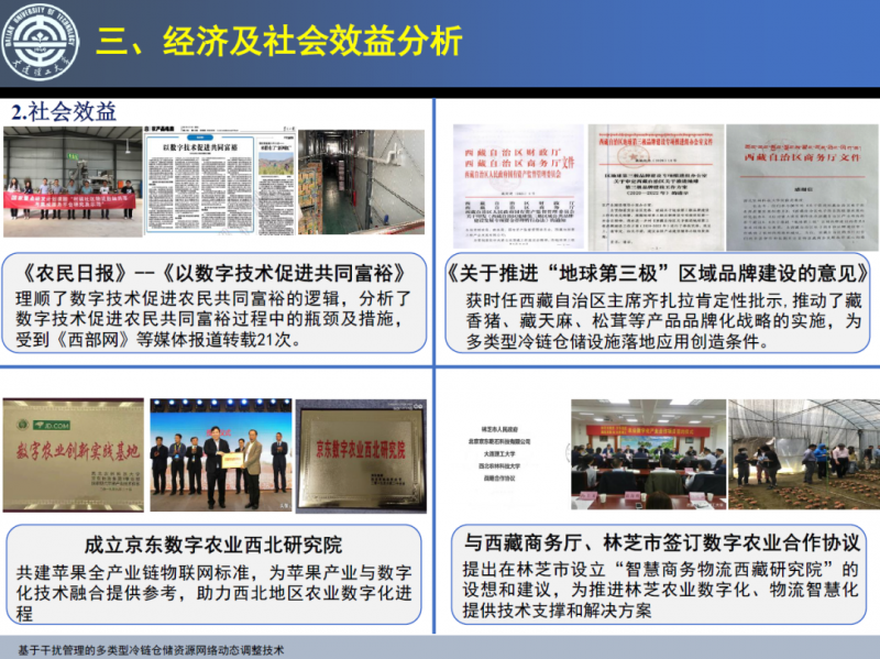 專家組經(jīng)評議認(rèn)為,成果針對生鮮農(nóng)產(chǎn)品多類型冷鏈倉儲資源網(wǎng)絡(luò)動態(tài)調(diào)整難題,采用文獻(xiàn)研究、實地調(diào)研、運(yùn)籌優(yōu)化以及模擬仿真等方法,建立了平臺模式多目標(biāo)下冷鏈倉儲資源網(wǎng)絡(luò)動態(tài)調(diào)整優(yōu)化框架,構(gòu)建了基于改進(jìn)Box splitting與自適應(yīng)大鄰域搜索的多目標(biāo)優(yōu)化高效求解方法,有利于解決冷鏈倉儲資源網(wǎng)絡(luò)受干擾下的動態(tài)調(diào)整難題,富有創(chuàng)新性,具有重要的學(xué)術(shù)價值與應(yīng)用價值。成果研發(fā)的基于干擾管理的多類型冷鏈倉儲資源網(wǎng)絡(luò)動態(tài)調(diào)整系統(tǒng),通過嵌入村鎮(zhèn)社區(qū)物流數(shù)據(jù)共享與集成平臺,在陜西、黑龍江等多家涉農(nóng)企業(yè)開展了示范應(yīng)用,為解決村鎮(zhèn)農(nóng)產(chǎn)品多類型冷鏈倉儲資源網(wǎng)動態(tài)調(diào)整難題提供了新方法和新技術(shù),經(jīng)濟(jì)和社會效益較顯著。成果面向我國村鎮(zhèn)多類型冷鏈倉儲資源網(wǎng)絡(luò)動態(tài)調(diào)整實際需求,實現(xiàn)了多種冷鏈倉儲資源的高效配置與動態(tài)調(diào)整,化解了有干擾、多目標(biāo)情形下冷鏈倉儲資源的動態(tài)調(diào)整難題,有利于促進(jìn)我國多類型冷鏈倉儲資源社會化服務(wù)平臺模式的建立,對于提高村鎮(zhèn)冷鏈倉儲運(yùn)營管理水平和降低冷鏈倉儲基礎(chǔ)設(shè)施運(yùn)營成本具有較大的應(yīng)用價值和推廣前景。該成果總體達(dá)到國內(nèi)先進(jìn)水平。