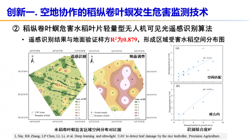 專家組經(jīng)評(píng)議認(rèn)為,成果針對(duì)當(dāng)前水稻施藥防控決策與病蟲害災(zāi)變信息不匹配、不對(duì)稱問題,提出了大數(shù)據(jù)驅(qū)動(dòng)的病蟲害防治綜合處方生成技術(shù),將定量遙感、物聯(lián)網(wǎng)、無線通信、導(dǎo)航定位等先進(jìn)技術(shù)應(yīng)用于植保無人機(jī)水稻病蟲害防控生產(chǎn)中,提出了空地協(xié)作的稻縱卷葉螟發(fā)生危害監(jiān)測技術(shù),研制了大數(shù)據(jù)驅(qū)動(dòng)的病蟲害防治綜合處方?jīng)Q策系統(tǒng),研發(fā)了農(nóng)資農(nóng)技植保無人機(jī)飛防作業(yè)智能管理系統(tǒng),形成了互聯(lián)網(wǎng)+的“病蟲害信息智能獲取—綜合處方?jīng)Q策—無人機(jī)精準(zhǔn)噴施”的智能化解決方案,在水稻病蟲害精準(zhǔn)防控上實(shí)現(xiàn)重要?jiǎng)?chuàng)新。該項(xiàng)技術(shù)的應(yīng)用,為科學(xué)施藥防治提供了指導(dǎo)依據(jù),改變了以人工現(xiàn)場調(diào)查、主觀經(jīng)驗(yàn)判斷是否打藥的經(jīng)驗(yàn)式植保方式,提升了水稻植保作業(yè)的智能化、信息化水平。該項(xiàng)技術(shù)在實(shí)際應(yīng)用過程中操作簡便、可靠性高,減少了人力物力投入、提高了防治效率,對(duì)按需施藥防治提供了智能技術(shù)手段。成果處于國內(nèi)領(lǐng)先水平,技術(shù)熟化程度高,經(jīng)濟(jì)社會(huì)成效顯著。