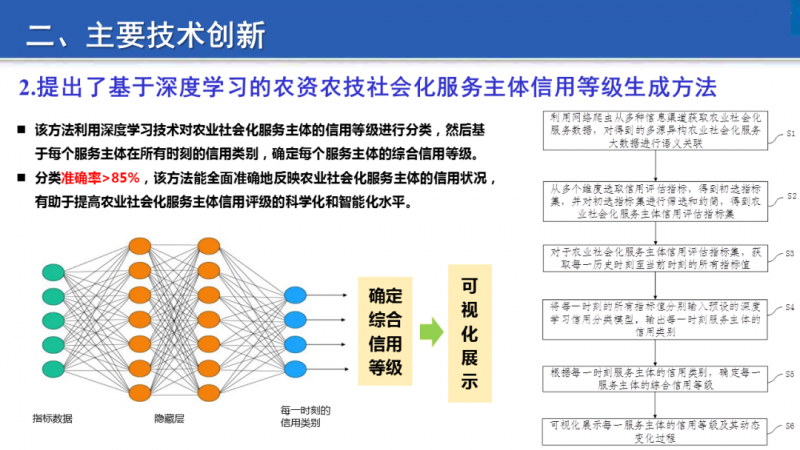 專家組經(jīng)評議認(rèn)為,成果構(gòu)建了具有領(lǐng)域針對性的農(nóng)資農(nóng)技社會化服務(wù)主體信用評級指標(biāo)體系,提出了基于深度學(xué)習(xí)和聯(lián)邦學(xué)習(xí)的農(nóng)資農(nóng)技社會化服務(wù)主體信用等級劃分方法,研發(fā)了農(nóng)資農(nóng)技社會化服務(wù)主體信用評級信息系統(tǒng),提高了農(nóng)資農(nóng)技社會化服務(wù)主體信用評級的自動化和智能化水平,技術(shù)集成水平和產(chǎn)品研發(fā)具有創(chuàng)新性。該成果具有評級結(jié)果客觀、操作簡便、更新頻率高、時(shí)效性強(qiáng)等特點(diǎn),可在一定程度上彌補(bǔ)傳統(tǒng)信用評級工作中主觀性較強(qiáng)等不足,有助于提升我國農(nóng)資農(nóng)技社會化服務(wù)主體信用評級的智能化水平,能夠促進(jìn)農(nóng)業(yè)社會化服務(wù)行業(yè)科技進(jìn)步。該成果建立了農(nóng)資農(nóng)技社會化服務(wù)主體信用評價(jià)體系,可在一定程度上解決新型農(nóng)業(yè)經(jīng)營主體缺乏合格抵質(zhì)押物、金融機(jī)構(gòu)缺少信用信息、整個(gè)行業(yè)缺少評價(jià)體系等問題。該成果已在浙江農(nóng)資集團(tuán)有限公司旗下的“呼呼打藥平臺”等產(chǎn)品中得到示范應(yīng)用,取得了良好的經(jīng)濟(jì)效益和社會效益。成果達(dá)到國內(nèi)領(lǐng)先水平,技術(shù)熟化程度高,具有廣闊的應(yīng)用前景。