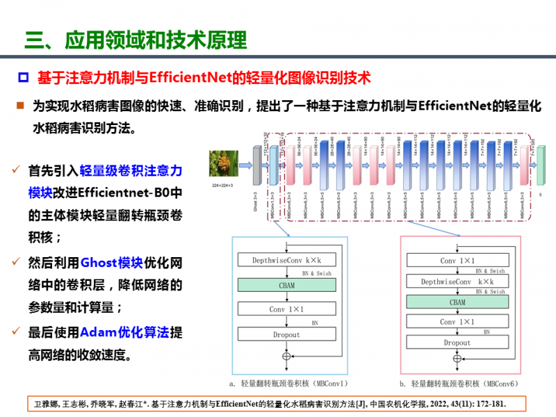 專家組經(jīng)評(píng)議認(rèn)為,成果為提高病蟲害圖像診斷的準(zhǔn)確率,研究了基于卷積神經(jīng)網(wǎng)絡(luò)集成的農(nóng)作物病蟲害智能診斷方法,提出了基于注意力機(jī)制與EfficientNet的輕量化圖像識(shí)別技術(shù)以及深度卷積神經(jīng)網(wǎng)絡(luò)動(dòng)態(tài)選擇集成技術(shù),為農(nóng)作物病蟲害的精準(zhǔn)防控提供了技術(shù)保障,具有明顯技術(shù)自主創(chuàng)新。該成果的應(yīng)用與推廣,提高了農(nóng)作物病蟲害識(shí)別的智能化程度,為農(nóng)作物病蟲害的精準(zhǔn)防控提供了技術(shù)保障,具有一定的市場(chǎng)競爭力。該成果操作簡便、可靠性高,能夠?qū)崿F(xiàn)農(nóng)作物病蟲害圖像的快速準(zhǔn)確識(shí)別。成果達(dá)到國內(nèi)外同類技術(shù)先進(jìn)水平,技術(shù)熟化程度高,具有較好的推廣應(yīng)用價(jià)值。