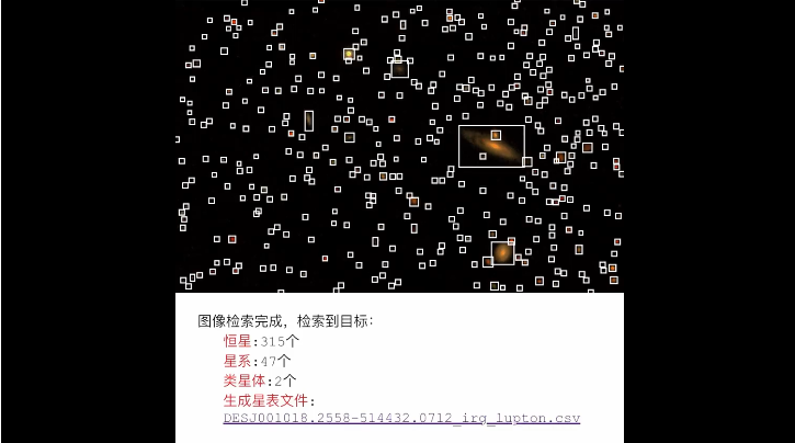 借助圖像描述等技術(shù),可以對(duì)天文圖像進(jìn)行自動(dòng)分析,并通過文字、圖像、語音等直接、友好的方式提供反饋結(jié)果。圖6展示了對(duì)暗能量相機(jī)遺珍巡天的一幅圖像自動(dòng)分析并生成文字反饋的示意圖。