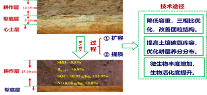 冬小麥秸稈還田“兩旋一深”增產(chǎn)增效技術(shù)的核心是:通過秸稈還田“兩旋一深”結(jié)合減氮這一簡(jiǎn)化輪耕模式,在維持產(chǎn)量潛力不降低的前提下降低整個(gè)生產(chǎn)系統(tǒng)的氮肥需求,實(shí)現(xiàn)系統(tǒng)固碳減排增產(chǎn)增效。對(duì)于土壤-大氣-小麥三個(gè)子系統(tǒng),一是改常年旋耕模式為“兩旋一深”,即每旋耕兩年深耕或深松一年,利用耕作技術(shù)環(huán)節(jié)加快秸稈腐解,改善土壤物理性狀、養(yǎng)分分布和有機(jī)質(zhì)含量,實(shí)現(xiàn)固碳減氮;二是在土體適當(dāng)深層擾動(dòng)前提下,建立小麥生產(chǎn)系統(tǒng)合理菌群結(jié)構(gòu),促進(jìn)養(yǎng)分循環(huán)轉(zhuǎn)化,降低土壤溫室氣體排放,實(shí)現(xiàn)減排;三是通過改善作物根系物理生存空間和養(yǎng)分空間分布來調(diào)優(yōu)小麥根系構(gòu)型,實(shí)現(xiàn)增產(chǎn)增效。