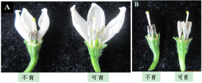 圖1辣椒砧木雄性不育系‘12114’及保持系花蕾(A)和花藥(B)比較