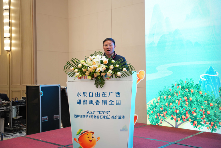 活動(dòng)現(xiàn)場(chǎng),來(lái)自西林縣推介組、中旭綠色新能源河北有限公司、河北省食品流通商會(huì)以及各行業(yè)企業(yè)家、農(nóng)業(yè)專家近200人齊聚一堂,共同見(jiàn)證了這場(chǎng)盛大的推介活動(dòng)。首先,西林縣委副書記、縣農(nóng)業(yè)農(nóng)村組副組長(zhǎng)姚瑞明發(fā)表了熱情洋溢的致辭,他表示,西林沙糖桔作為當(dāng)?shù)氐奶厣r(nóng)產(chǎn)品,具有獨(dú)特的品質(zhì)和口感,希望通過(guò)此次推介活動(dòng),進(jìn)一步提升西林沙糖桔品牌的市場(chǎng)辨識(shí)度和品牌效應(yīng),實(shí)現(xiàn)西林“文化走出去”、“品牌亮起來(lái)”、“客源引進(jìn)來(lái)”目標(biāo),聯(lián)動(dòng)“一區(qū)一帶一中心”文旅發(fā)展新格局,推動(dòng)西林特色農(nóng)業(yè)產(chǎn)品產(chǎn)業(yè)發(fā)展,增強(qiáng)西林品牌知名度、美譽(yù)度和市場(chǎng)競(jìng)爭(zhēng)力,拓展北方市場(chǎng)。
