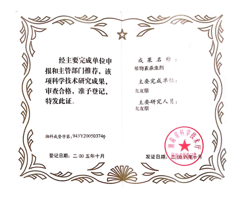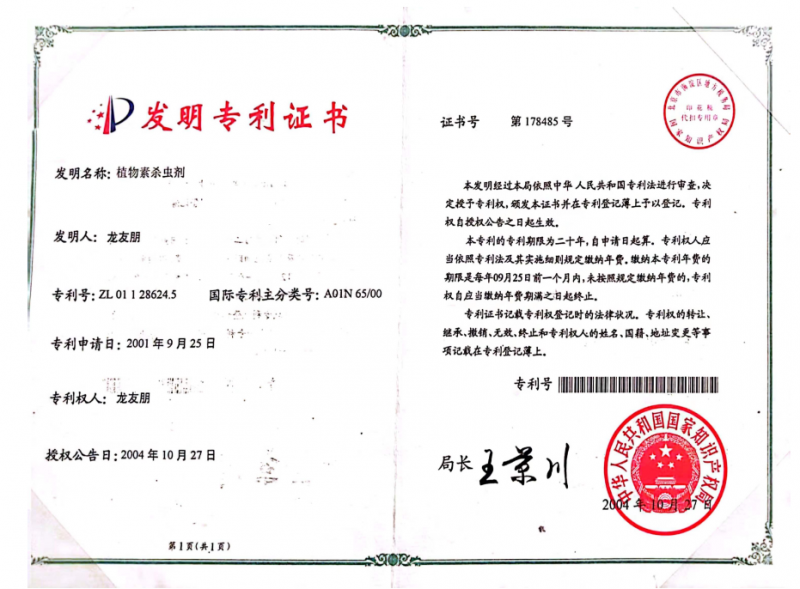 發(fā)明的主要原理是:(略)通過實驗證明,它對菜青蟲、小菜蛾、菜螟、蚜蟲、斜紋夜蛾、茶葉毛蟲、菜蟻、稻飛虱、稻卷螟、鉆心蟲等病蟲害有較好的殺蟲和防治效果。
