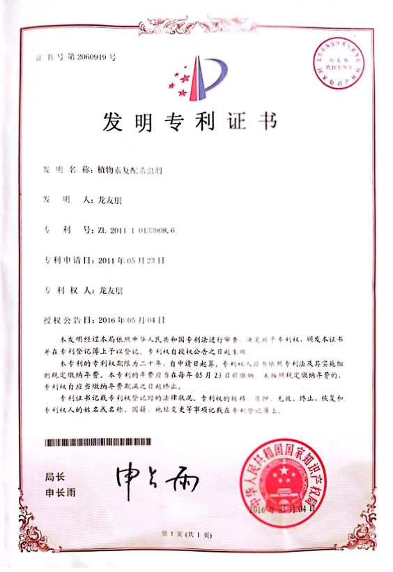 本發(fā)明的有益效果是:對比文件1與本專利都是一種生物農(nóng)藥制劑,屬于相同的技術(shù)領(lǐng)域,對比文件1中是通過取樟樹葉、苦楝樹葉、臭椿樹葉用清水泡制或直接壓榨擠劑過濾取其葉液混合液而制成,本發(fā)明雖然也是大采取植物素配制而成,但基本上是采用成品原料配制而成,而非直接采用植物制作而成,生產(chǎn)過程相對簡單,配制出來的產(chǎn)品成份更加穩(wěn)定,它是一種廣譜、高效、低毒、易降解、無殘留的殺蟲劑且沒有抗藥性的環(huán)保農(nóng)藥,可防治菜青蟲、小菜蛾、菜螟、蚜蟲、斜紋夜蛾、茶葉毛蟲、菜蟻、稻飛虱、稻卷螟、鉆心蟲等,而且生產(chǎn)工藝簡便、生產(chǎn)成本較低,具有很好的市場前景。