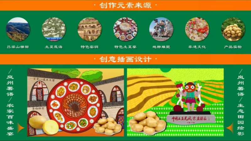 本次“嵐州薯語(yǔ)”創(chuàng)意設(shè)計(jì),正是以嵐縣馬鈴薯的生態(tài)價(jià)值與文化價(jià)值為雙核心展開(kāi)創(chuàng)作。設(shè)計(jì)圖其一以“生態(tài)田園繪影”為主題:畫面提取呂梁山梯田的層疊肌理、土豆花海的蓬勃生機(jī),搭配地標(biāo)雕塑,用明快的色彩與手繪質(zhì)感,還原嵐縣馬鈴薯生長(zhǎng)的綠色秘境——這里沒(méi)有工業(yè)污染,只有青山綠水的滋養(yǎng),每一顆土豆都帶著陽(yáng)光與土壤的純凈氣息。設(shè)計(jì)圖其二聚焦“農(nóng)家百味盛宴”:以特色窯洞為背景,中央凸顯108道特色土豆宴,金黃的土豆與琳瑯滿目的菜品相映成趣,展現(xiàn)嵐縣人將土豆“點(diǎn)土成金”的烹飪智慧。