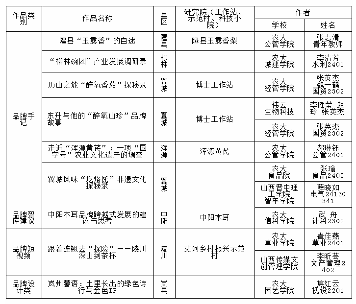 此次活動,由山西農(nóng)業(yè)大學和山西省品牌研究會等單位聯(lián)合發(fā)起,以山西農(nóng)業(yè)大學的“晉農(nóng)學子智庫研習工坊”(關注人數(shù)破400+)及其跨學科導師團隊為內(nèi)容生產(chǎn)的運作方,以產(chǎn)出優(yōu)秀成果為導向,通過一對一專題輔導、定向邀請等方式精心組織指導,中國農(nóng)業(yè)科技推廣網(wǎng)、中國大學生在線、山西農(nóng)民報強農(nóng)科技、鄉(xiāng)村發(fā)展研究等4家媒體開設專欄同步轉載發(fā)布此次活動的優(yōu)秀作品,及校內(nèi)外的創(chuàng)新創(chuàng)業(yè)學院、晉農(nóng)公管、溫心語錄、陵川青年、太行藥鄉(xiāng)中藥產(chǎn)業(yè)網(wǎng)等新媒體持續(xù)關注大學生推薦官消息和作品,已遴選發(fā)布品牌手記、品牌智庫建議、品牌短視頻、品牌設計類等4大類作品9篇優(yōu)秀作品,率先推薦了隰縣、柳林、翼城、渾源、中陽、陵川、嵐縣等7個縣的玉露香梨、柳林碗團、醉氧香菇、渾源黃芪、中陽木耳、陵川連翹、嵐縣馬鈴薯等7個地理標志產(chǎn)品,參與大學生或創(chuàng)業(yè)新農(nóng)人涉及山西農(nóng)大公管、城建、經(jīng)管、信科、草業(yè)、園藝,以及山西傳媒文創(chuàng)管理學院、山西偉云生物科技等單位8個不同專業(yè)背景的13名作者,文稿累計超過54000字、圖片85張,展現(xiàn)了新時代大學生生動活力、獨特潛力及他們的為農(nóng)情懷,為鄉(xiāng)村振興注入澎湃的青春動能。