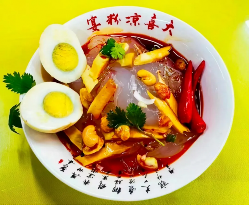 《東京夢華錄》有載,涼粉不僅是一道可口的小吃,還有消暑祛熱的功效。從營養(yǎng)角度來看,涼粉含水量達80%,在給人體補充水分的同時,也起到了促進新陳代謝,潤腸通便,給腸道“減負”的作用。其次,涼粉里的天然植物膠質(zhì)是天然的“養(yǎng)顏因子”,它不僅能溫和滋養(yǎng)肌膚,讓皮膚保持水潤彈性,還能由內(nèi)而外改善氣色,潛移默化地調(diào)節(jié)內(nèi)分泌,幫助女性穩(wěn)住身體狀態(tài)。最后,大量的碳水化合物是它的“隱藏屬性”,食用后極易產(chǎn)生飽腹感,讓人享受美味時,不自覺減少其他高熱量食物的攝入,悄然成為瘦身路上的“助力者”,讓人們滿足味蕾的同時,也能輕松的管理身材。