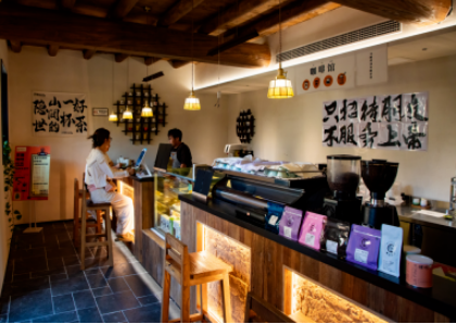 推開(kāi)咖啡體驗(yàn)區(qū)斑駁的木門,仿佛穿越了時(shí)空——前廳是飄著咖啡香的現(xiàn)代吧臺(tái),穿過(guò)回廊,東院的咖啡烘焙工坊正飄出豆子爆裂的焦香。這種“前店后坊”的布局,讓游客能完整見(jiàn)證從生豆到咖啡的全過(guò)程,楊柯愷特意保留了老宅的原有磚木結(jié)構(gòu),粗獷的房梁下懸掛著明亮的虹吸壺,斑駁的灰墻前擺放著北歐風(fēng)家具,碰撞出奇妙的視覺(jué)張力?!霸诠糯遄隹Х炔皇峭硕笃浯?,而是主動(dòng)選擇。”楊柯愷邊調(diào)整磨豆機(jī)邊對(duì)我說(shuō)。內(nèi)院改造成綠植環(huán)繞的露天座,陽(yáng)光透過(guò)枝葉在咖啡杯里投下光斑,游客們捧著咖啡在屋頂上拍照打卡。這種“咖啡+古建+自然”的復(fù)合體驗(yàn),讓日均客流量穩(wěn)定在200人次以上,節(jié)假日高峰期可達(dá)500人次。豆趣咖啡坊不是單打獨(dú)斗,而是與園區(qū)其他工坊形成共生關(guān)系,與周邊民宿聯(lián)合推出“圍爐煮茶”“咖啡套餐”的優(yōu)惠活動(dòng),木藝坊的體驗(yàn)課以他們的咖啡作為茶歇,這種聯(lián)動(dòng)不僅讓獲客成本直降40%,更讓每位游客帶走的都是完整的古村記憶—既有咖啡的醇香,也有老宅的溫度