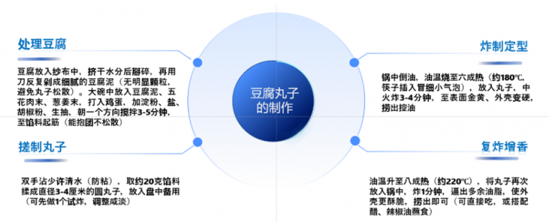 為了讓手藝更好地傳承,非遺工坊還編寫了《五臺(tái)豆腐丸子制作技藝圖譜》,將老匠人的經(jīng)驗(yàn)轉(zhuǎn)化為可量化的標(biāo)準(zhǔn),比如豆腐與調(diào)料的配比、煎制的溫度區(qū)間等,既保留了傳統(tǒng)精髓,又方便新手學(xué)習(xí)。這讓更多人意識(shí)到,做丸子不只是謀生的手藝,更是值得驕傲的文化傳承。