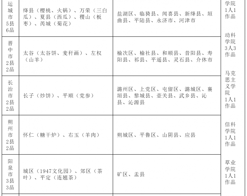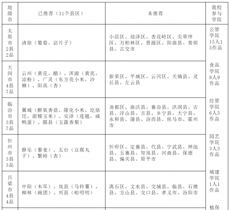 第1季的大學(xué)生推薦官活動(dòng),期待對(duì)山西11市117縣的特優(yōu)農(nóng)產(chǎn)品的推薦全覆蓋,目前已推薦31個(gè)縣(市、區(qū))的43個(gè)特優(yōu)農(nóng)產(chǎn)品,還有待更多青年力量、社會(huì)力量參與進(jìn)來(lái),助力特優(yōu)農(nóng)產(chǎn)品高質(zhì)量發(fā)展,《特優(yōu)農(nóng)產(chǎn)品推薦已完成縣和待推薦縣概況》(見(jiàn)附件1)