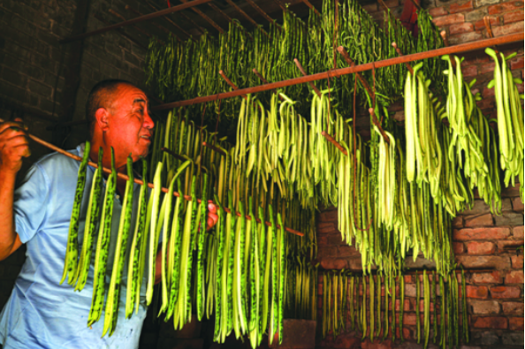先以特制工具削去黃瓜外皮、順長分四條,再置于架桿上用50℃爐火烘烤一晝夜;烤后扎起密封入缸或裝袋封口,既實(shí)現(xiàn)長期存放,又留存本味,每一步皆為鎖住黃瓜干的脆嫩質(zhì)感。