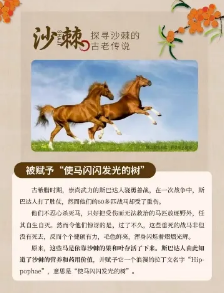 關于沙棘的傳說,更添了幾分傳奇色彩。古希臘時期,斯巴達人發(fā)現(xiàn)受傷的戰(zhàn)馬啃食沙棘果后,竟能慢慢恢復體力、毛色發(fā)亮,于是把這種植物叫做“讓馬閃閃發(fā)光的樹”,這便是“沙棘”學名的由來。而在我國元代,成吉思汗西征時,將士們因為水土不服紛紛病倒,最后靠著吃沙棘果才好轉,沙棘也因此被封為“圣果”,成了行軍路上的“健康守護者”。