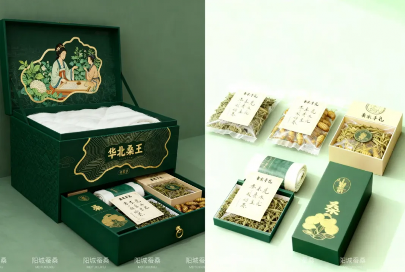 禮盒采用“書(shū)匣式”結(jié)構(gòu),外盒以深桑綠為底色,燙金呈現(xiàn)“華北桑王”的輪廓與蠶絲紋理,盒蓋內(nèi)側(cè)印有《嫘祖教蠶圖》插畫(huà),打開(kāi)禮盒如同翻開(kāi)一本蠶桑文化典籍。