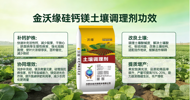 在長期集約化種植、化肥過量施用的當下,土壤酸化、板結(jié)、養(yǎng)分失衡、連作障礙等問題日益突出,成為制約作物 產(chǎn)量與品質(zhì)的“隱形瓶頸”。單位補充氮磷鉀的傳統(tǒng)施肥模式,已無法滿足現(xiàn)代農(nóng)業(yè)“健康土壤,優(yōu)   質(zhì)高產(chǎn)”的雙重需求。金沃緣硅鈣鎂土壤調(diào)理劑,以天 然礦物為基、多元營養(yǎng)為核、土壤修 復為本,通過硅、鈣、鎂三大核心元素的協(xié)同增效,不僅精 準補充作物必 須中微量元素,更從根源改 善土壤環(huán)境,為作物生長筑牢根基,實現(xiàn)改土、壯株、提質(zhì)、增產(chǎn)的多重功效,是區(qū)別于普通肥料的土壤健康全 能型產(chǎn)品