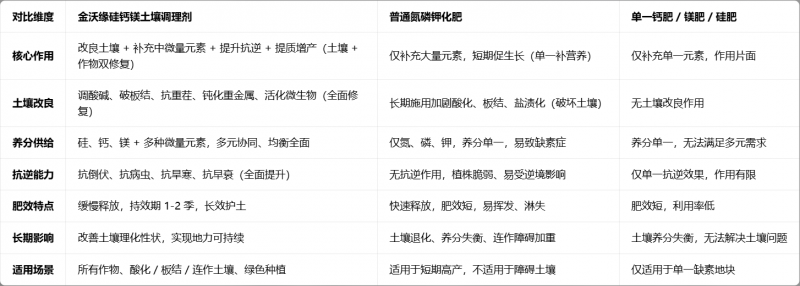 三、金沃緣硅鈣鎂土壤調(diào)理劑 VS 普通肥料:核心差異與優(yōu)勢對比