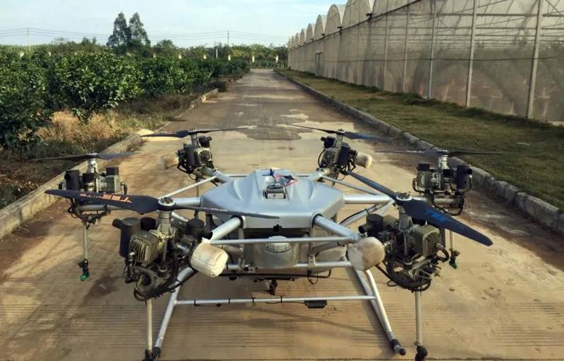 廣西立華使用的無人機(jī)是由翼騰飛防公司研發(fā)的新型油動力重載無人機(jī),續(xù)航達(dá)4小時,最大載重60公斤,飛行噴藥覆蓋寬幅達(dá)到6至15米,特別適合果園噴藥。左老板的300多畝柑橘園,只要一天的時間,便完成了春季促花壯蕾農(nóng)藥的噴灑。