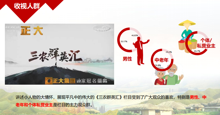 節(jié)目內(nèi)容勵志,調(diào)性上揚,緊抓主流題材,講好“三農(nóng)”故事,樹立良好的奮斗夢典范,成功勵志的過程中弘揚社會正能量。