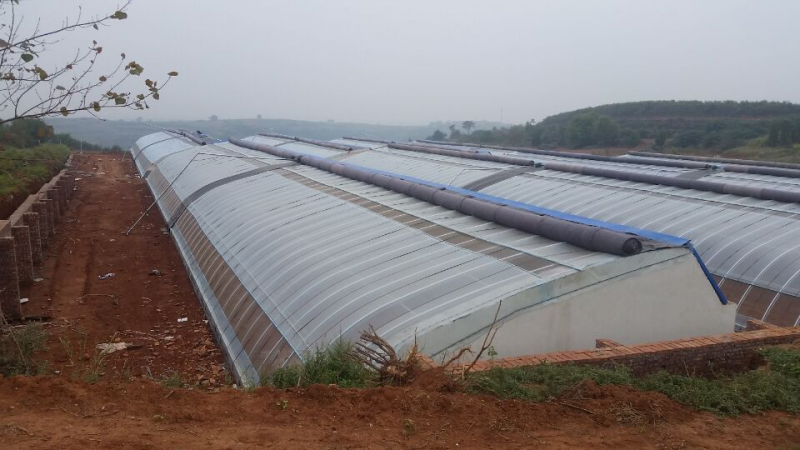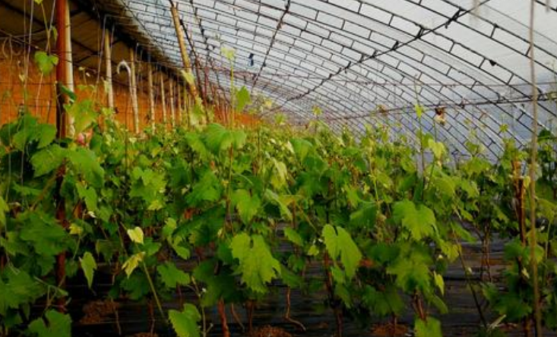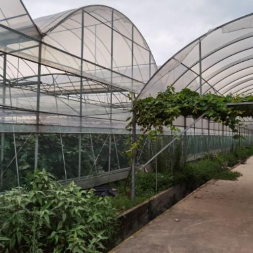 1.1日光溫室  日光溫室東西走向,北、東、西三面墻均為磚墻或加厚土墻,墻體內(nèi)可設(shè)夾心保溫層;南向?yàn)槭芄饷妫盟芰媳∧じ采w,陽(yáng)光充足,上覆保溫草簾或保溫被,保溫效果好。傳統(tǒng)日光溫室無(wú)輔助加溫設(shè)備。改良式日光溫室配備有熱風(fēng)加熱或暖氣(水暖)加熱,或是在土層下鋪設(shè)送熱管道,給土壤加溫。  日光溫室的透光性能好,保溫與增溫性能優(yōu)良,造價(jià)適中,適合葡萄提前或延后栽培。有輔助加熱的改良式日光溫室可以從事葡萄周年生產(chǎn)。日光溫室單棟面積適中,一般長(zhǎng)度50米,跨度612米。