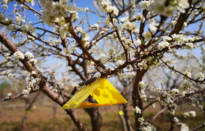 選有代表性、面積不小于5×666.7 m2的桃園或梨園3塊,每園每畝地懸掛1套誘捕器,誘捕器懸掛于果樹(shù)的陰面通風(fēng)處,懸掛高度約在樹(shù)冠中下部貨距離地面1-1.5米處。