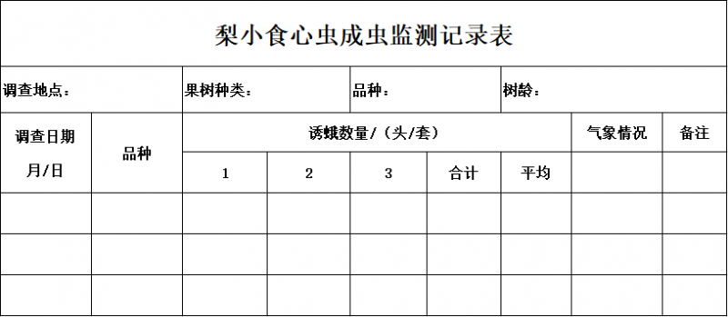 每天定時(shí)檢查三角屋誘捕器中的成蟲(chóng)數(shù)量,結(jié)果記入表內(nèi)(可參考上方表格)。誘捕器粘蟲(chóng)板,定時(shí)更換,誘芯每30天更換一次。