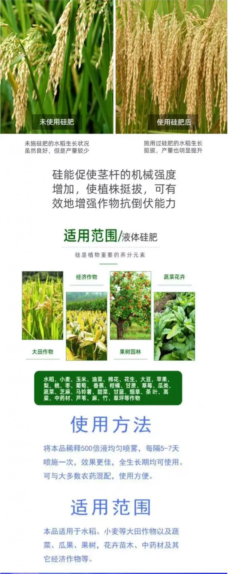 硅是植物體組成的重要營養(yǎng)元素,被土壤列為繼氮磷鉀之后的第四大元素,硅肥對作物的生長有著促使作用,能增強(qiáng)植物光合作用,提高葉綠素含量。液體形硅肥,進(jìn)行葉面噴施、沖施、滴灌均可。與一般硅肥相比,它克服了傳統(tǒng)硅肥不易溶解、作物難以吸收的缺點,吸收效果對比普通硅肥較好。