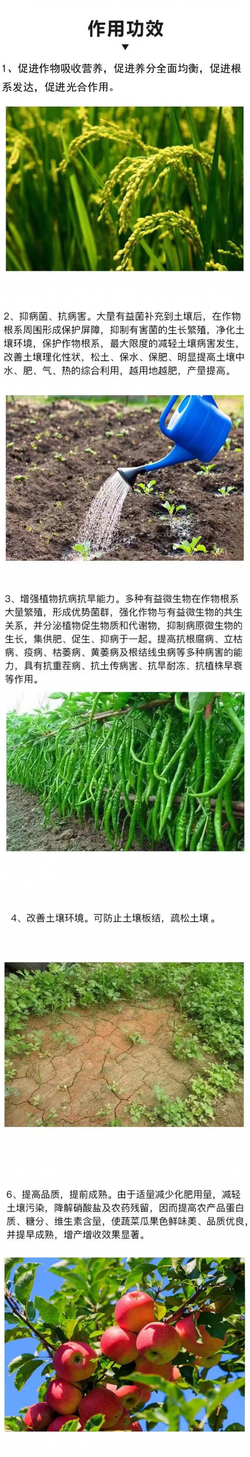 3、增強(qiáng)植株抗病抗旱能力。多種有益微生物在作物根系大量繁殖,形成優(yōu)勢菌群,強(qiáng)化作物與有益微生物的供水關(guān)系,集供肥、促生、抑病于一起。提高抗根腐病、立枯病、疫病、枯萎病、黃萎病及根結(jié)線蟲病等多種病害的能力,具有抗重茬病、抗土傳病害、抗旱耐凍、抗植株早衰等作用。